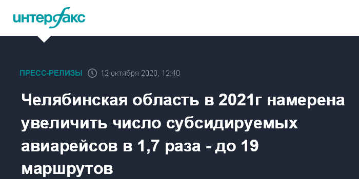 Челябинск. 12 октября. Челябинская область в 2021 году планирует увеличить количество субсидируемых межрегиональных рейсов до 19 против 11, которые действуют в текущем году, сообщает пресс-служба главы региона со ссылкой на губернатора Алексея Текслера.