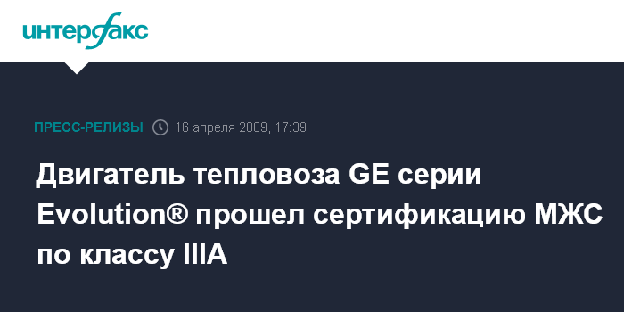 Эри, Пенсильвания, США (16 апреля 2009 г.) BUSINESS WIRE – Сегодня GE Transportation, подразделение General Electric Company (код на Нью-йоркской фондовой бирже: GE), объявила, что она получила сертификаты МЖС номер E-001/2009-02 на свои дизельные двигатели Evolution® V12, которыми оснащены ее тепловозы серии Evolution. В ходе инспекции МЖС (Международного железнодорожного союза), которая включает испытание на выносливость и анализ выброса выхлопных газов в атмосферу, были проверены механические показатели двигателя и его соответствие строгим требованиям экологических стандартов IIIA МЖС.