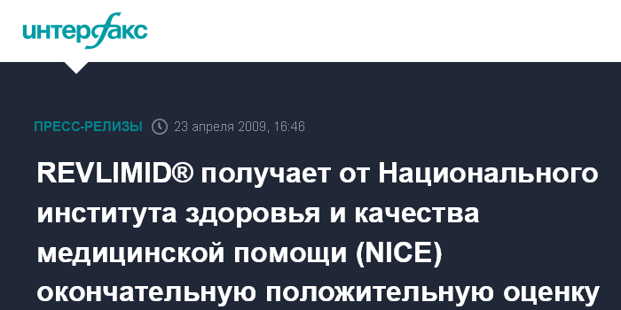 Будри (Швейцария). 23 апреля BUSINESS WIRE – Компания Celgene International Sarl (NASDAQ: CELG) объявила сегодня о том, что Национальный институт здоровья и качества медицинской помощи (NICE) принял Постановление об окончательной оценке (Final Appraisal Determination, FAD), в котором REVLIMID в сочетании с дексаметазоном рекомендован, в рамках разрешенных для него показаний, в качестве возможного метода лечения в Англии и Уэльсе пациентов с множественной миеломой, ранее проходивших один или два курса лечения. NICE постановил, что REVLIMID как инновационная, продлевающая жизнь терапия, является рентабельным средством для использования Национальной службой здравоохранения (NHS).