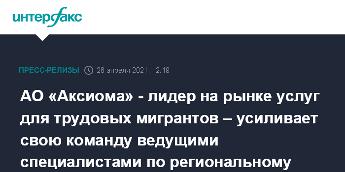 26 апреля 2021 г., г. Москва - ГК «Аксиома» – лидер на рынке услуг для трудовых мигрантов –усиливает свою команду ведущими специалистами в этой области.