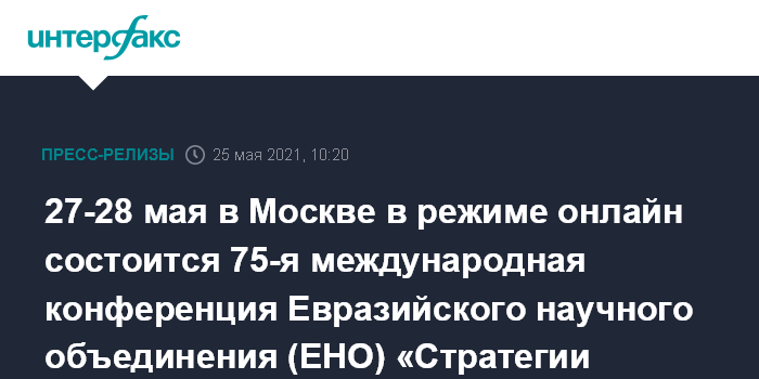 27-28 мая в Москве в режиме онлайн состоится 75-я международная конференция Евразийского научного объединения (ЕНО) «Стратегии устойчивого развития мировой науки».
