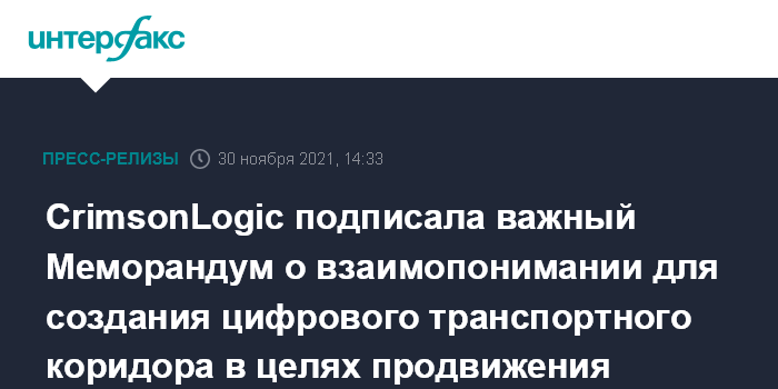 СИНГАПУР / НУР-СУЛТАН, КАЗАХСТАН - СМИ - 30 ноября 2021 г. - CrimsonLogic — ведущий мировой поставщик торговых решений, продуктов и услуг с головным офисом в Сингапуре— подписала Меморандум о взаимопонимании (МОВ) с компаниями «KTZ Express» (дочернее подразделение Казахстанской железнодорожной компании и национальный логистический оператор) и Digital Silk Way (местный ИТ-партнер) с целью сотрудничества и создания цифрового транспортного коридора для развития торговли как в регионе, так и за его пределами.