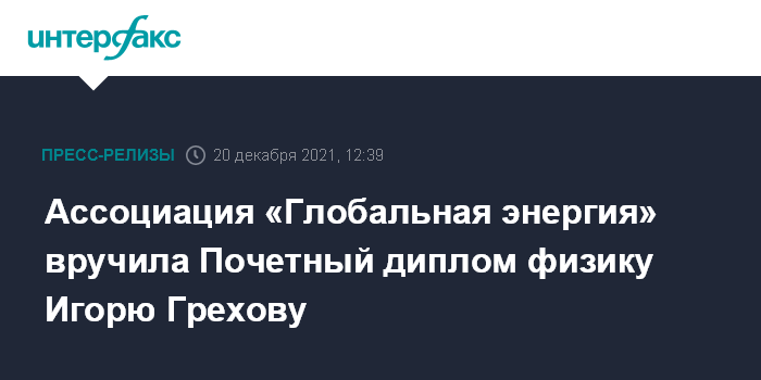 Ассоциация «Глобальная энергия» вручила Почетный диплом физику Игорю Грехову