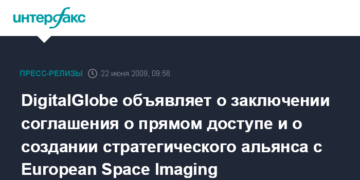 BUSINESS WIRE - DigitalGlobe объявляет о заключении соглашения о прямом доступе и о создании стратегического альянса с European Space Imaging и с Space Imaging Middle East
