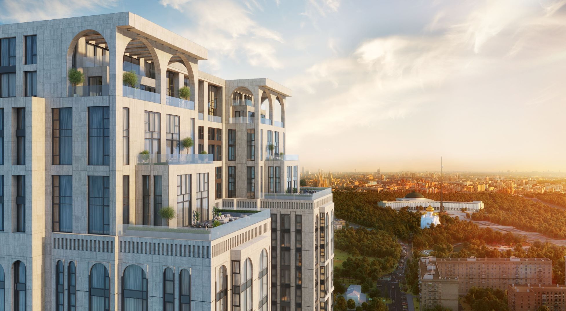 Кроме локации, не может не привлечь уникальная, знаковая архитектура, над которой работало международное бюро Tabanlıoğlu Architects, а также довольно редкий для Москвы формат апартаментов с гостиничным сервисом. На первых этажах будет располагаться пятизвездочный отель, услугами которого может воспользоваться любой из жителей апартаментов. Сервис включает в себя рестораны и бары, фитнес-центр, панорамный бассейн, хаммам, бизнес пространства. А на верхних этажах расположатся пентхаусы с террасами и роскошными видами на город. Еще одно важное достоинство всех апартаментов – это чистовая, премиальная отделка в трех стилях.