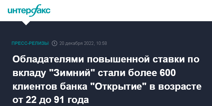 Обладателями повышенной ставки по вкладу "Зимний" стали более 600 клиентов банка "Открытие" в возрасте от 22 до 91 года
