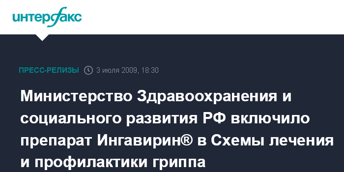 Министерство Здравоохранения и социального развития РФ включило препарат Ингавирин® в Схемы лечения и профилактики гриппа, вызванного вирусом типа А/H1N1