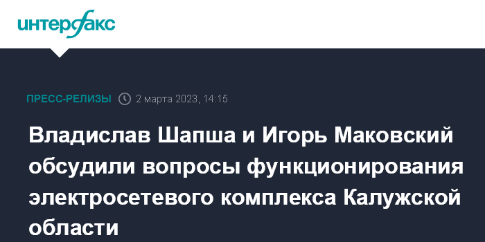 Владислав Шапша и Игорь Маковский обсудили вопросы функционирования электросетевого комплекса Калужской области