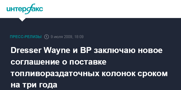 BUSINESS WIRE - Соглашение определяет статус Dresser Wayne как основного поставщика для точек розничных продаж BP