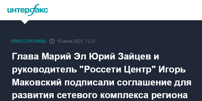 На площадке Петербургского международного экономического форума (ПМЭФ) Глава Марий Эл Юрий Зайцев и генеральный директор ПАО "Россети Центр" – управляющей организации ПАО "Россети Центр и Приволжье" Игорь Маковский заключили соглашение о сотрудничестве для развития электросетевого комплекса региона и формирования благоприятного инвестиционного климата на территории республики.