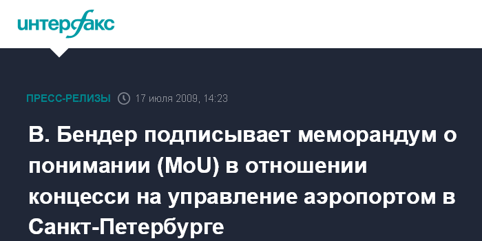 17 июля 2009 года - APA OTS - FRA/Munchen/jh - Председатель правления Fraport AG, Вильгельм Бендер (Prof. Dr. Wilhelm Bender), и губернатор города Санкт-Петербург, Валентина Матвиенко, сегодня, в рамках "Петербургского диалога 2009" в Мюнхене, в присутствии канцлера Федеративной Республики Германия Ангелы Меркель (Angela Merkel) и президента Российской Федерации Дмитрия Медведева подписал меморандум о понимании ("Memorandum of Understanding", (MoU). Заявление о намерениях выражает стремление города Санкт-Петербург и компании Fraport AG подвести переговоры о концессионном договоре по развитию, модернизации и эксплуатации оборудования аэропорта Пулково к успешному завершению.
