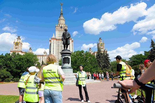 После инструктажа участники отправились в культурно-познавательное путешествие по Москве с профессиональным экскурсоводом. Маршрут первой экскурсии был проложен по специально оборудованным велосипедным дорожкам и проходил через такие значимые культурные объекты, как Главное здание МГУ, памятники русскому государственному деятелю И.И. Шувалову и первому русскому ученому-естествоиспытателю М.В. Ломоносову. Экскурсия завершилась на смотровой площадке Воробьевых гор, где участникам мероприятия открылся невероятный вид на церковь Живоначальной Троицы и Международный деловой центр Москва-Сити.