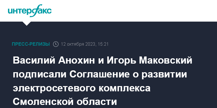 Василий Анохин и Игорь Маковский подписали Соглашение о развитии электросетевого комплекса Смоленской области