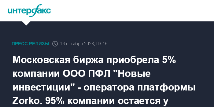 Московская биржа приобрела 5% компании ООО ПФЛ "Новые инвестиции" - оператора платформы Zorko. 95% компании остается у основателя.