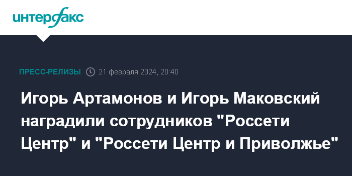 Игорь Артамонов и Игорь Маковский наградили сотрудников "Россети Центр" и "Россети Центр и Приволжье"