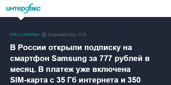В России открыли подписку на смартфон Samsung за 777 рублей в месяц. В платеж уже включена SIM-карта с 35 Гб интернета и 350 минутами разговоров в месяц. Оператором программы является компания Smarta и сайт smartastore.ru