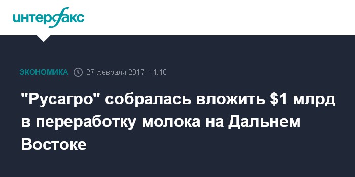 Москва. 27 февраля. INTERFAX.RU - Группа "Русагро", которая ведет строительство крупного свиноводческого комплекса на Дальнем Востоке, готова инвестировать от $1 млрд в новый проект по переработке молока в этом регионе. "Мы готовы проинвестировать минимум $1 млрд в молокопереработку, это новый проект", - сказал основной владелец группы "Русагро" Вадим Мошкович, выступая на Российском инвестиционном форуме в Сочи.