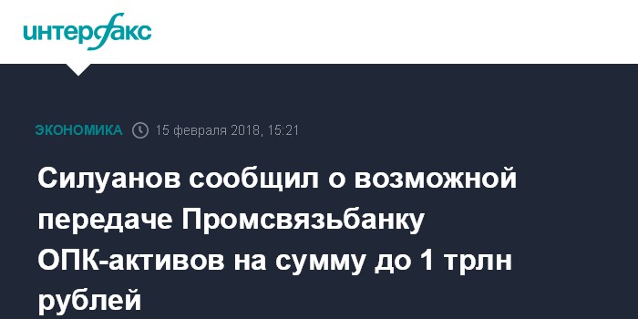 Москва. 15 февраля. INTERFAX.RU - Промсвязьбанк может получить от других кредитных организаций на баланс до 1 трлн рублей кредитов, выданных предприятиям ОПК, при этом передача активов будет сопровождаться передачей капитала, заявил журналистам глава Минфина Антон Силуанов.