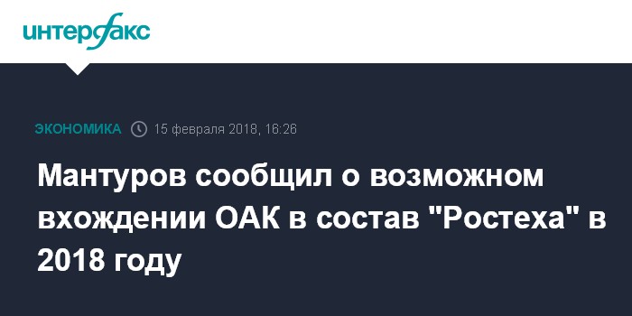Москва. 15 февраля. INTERFAX.RU - "Объединенная авиастроительная корпорация" (ОАК) может войти в состав госкорпорации "Ростех" до конца года, сообщил в четверг "Интерфаксу" министр промышленности и торговли РФ Денис Мантуров.