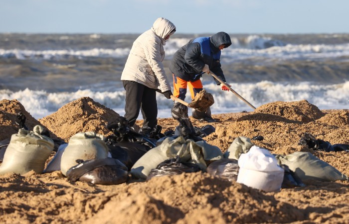 Ранее глава Краснодарского края Вениамин Кондратьев сообщал, что наиболее загрязненные участки берега - Благовещенская коса в Анапе (около 1 км) и поселок Витязево (около 3 км). Слой - от 10 до 15 сантиметров. На сбор нефтепродуктов с пляжей может уйти около месяца. Там работают сейчас более 6 тысяч спасателей и волонтеров со всей России.