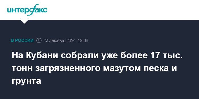 Москва. 22 декабря. INTERFAX.RU - Спасатели и волонтеры собрали с пляжей Черноморского побережья Краснодарского края более 17 тысяч тонн грунта и песка, загрязненного после разлива топлива из-за крушения танкеров, сообщает пресс-служба ГУ МЧС России по региону.