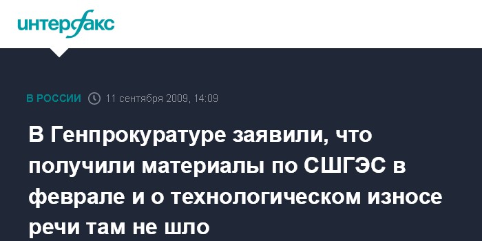 Москва. 11 сентября. INTERFAX.RU - В Генеральной прокуратуре России опровергли сведения о том, что еще два года назад в это ведомство поступили материалы Счетной палаты РФ, которые свидетельствовали о 85-процентном технологическом износе на Саяно-Шушенской ГЭС.