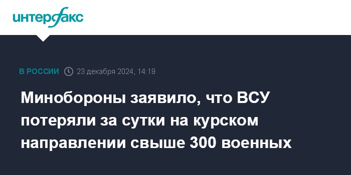 Москва. 23 декабря. INTERFAX.RU - Потери украинских войск на курском направлении за минувшие сутки составили более 300 военнослужащих, всего за время боевых действий противник потерял там свыше 43 310 человек, сообщило министерство обороны РФ в понедельник.