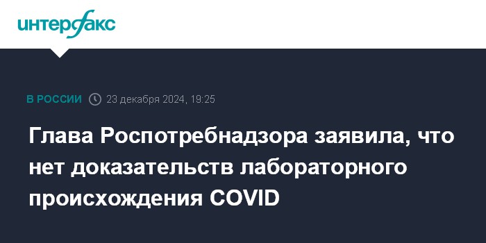 Москва. 23 декабря. INTERFAX.RU - Доказательств того, что вирус COVID-19 имеет лабораторное происхождение, нет, заявила глава Роспотребнадзора Анна Попова.