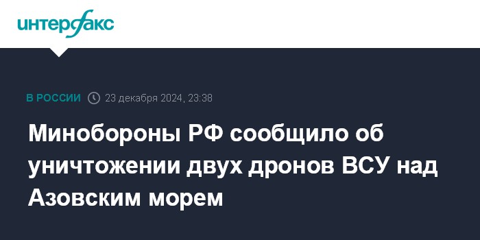 Москва. 23 декабря. INTERFAX.RU - Российские военные вечером в понедельник сбили два украинских беспилотника над Азовским морем, сообщили в Минобороны РФ.