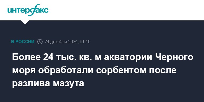 Москва. 24 декабря. INTERFAX.RU - Специалисты обработали сорбентом более 24 тыс. кв. м акватории Черного моря после разлива топлива из-за крушения танкеров, сообщили в оперштабе Краснодарского края во вторник.