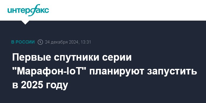 Москва. 24 декабря. INTERFAX.RU - Космические аппараты серии "Марафон-IoT", входящей в федеральный проект "Сфера", планируется запустить на орбиту в первой половине 2025 года, сообщил гендиректор "Роскосмоса" Юрий Борисов.