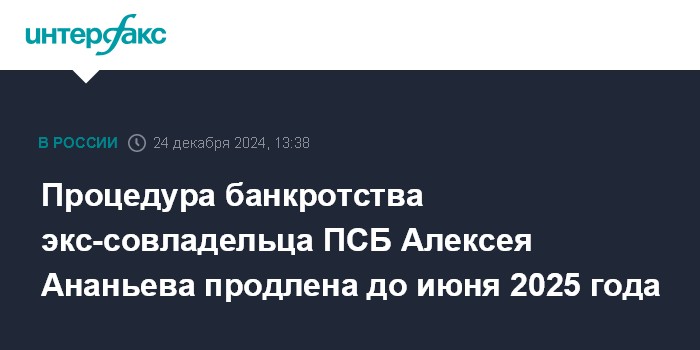 Москва. 24 декабря. INTERFAX.RU - Арбитражный суд Москвы в начале декабря продлил процедуру банкротства бывшего совладельца Промсвязьбанка (ПСБ) Алексея Ананьева на шесть месяцев, до 28 мая 2025 года.