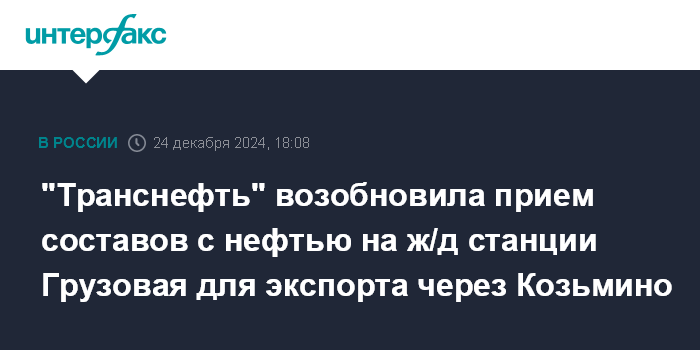 Москва. 24 декабря. INTERFAX.RU - "Транснефть - Дальний Восток" возобновила прием составов с нефтью на железнодорожной станции "Грузовая".