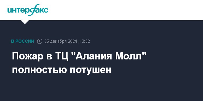 Москва. 25 декабря. INTERFAX.RU - Пожарные полностью потушили возгорание в ТЦ "Алания Молл" во Владикавказе, сообщила пресс-служба МЧС РФ..