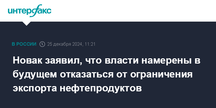 Москва. 25 декабря. INTERFAX.RU - Власти рассчитывают в будущем отказаться от применения таких инструментов, как ограничение экспорта нефтепродуктов, заявил вице-премьер РФ Александр Новак в интервью телеканалу "Россия 24".