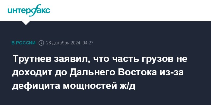 Москва. 26 декабря. INTERFAX.RU - Морские порты Дальнего Востока справляются с значительно возросшей нагрузкой, но часть грузов не доходит до них из-за дефицита провозных мощностей железной дороги, сообщил вице-премьер - полномочный представитель президента РФ в ДФО Юрий Трутнев в интервью каналу "Россия 24" (ВГТРК) в четверг.