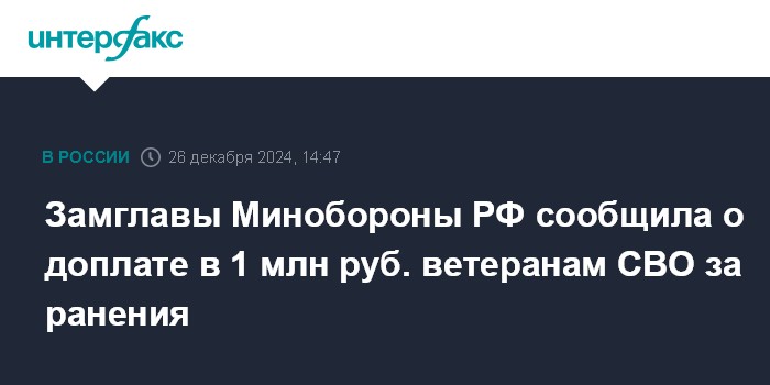 Замглавы Минобороны РФ сообщила о доплате в 1 млн руб. ветеранам СВО за ранения