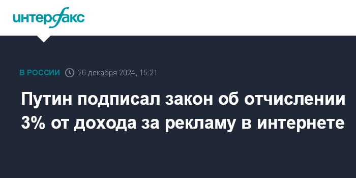 Москва. 26 декабря. INTERFAX.RU - Президент подписал закон об уплате обязательных отчислений в бюджет в размере 3% дохода за квартал от распространения в интернете рекламы, направленной на российского потребителя. Документ опубликован на официальном портале правовой информации.
