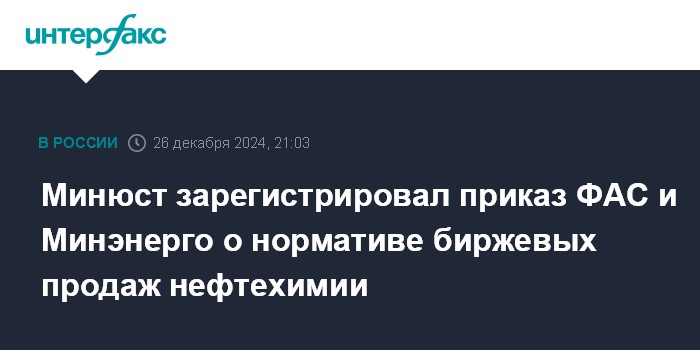 Минюст зарегистрировал приказ ФАС и Минэнерго о нормативе биржевых продаж нефтехимии