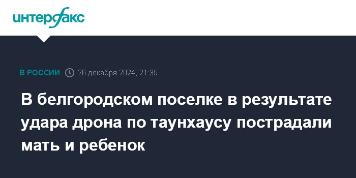 Москва. 26 декабря. INTERFAX.RU - В поселке Разумное в Белгородском районе в результате удара дрона по таунхаусу пострадали восьмилетний ребенок и его мать, сообщил в телеграм-канале губернатор Белгородской области Вячеслав Гладков.