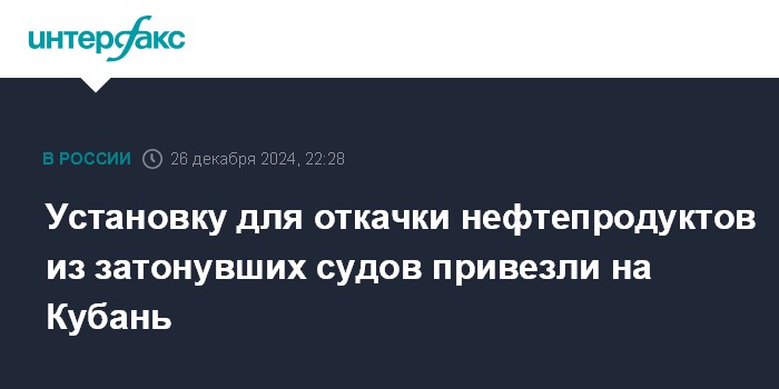 Москва. 26 декабря. INTERFAX.RU - В Краснодарский край привезли установку для откачки нефтепродуктов из затонувших судов, идет подготовка к испытаниям, сообщает оперативный штаб региона.
