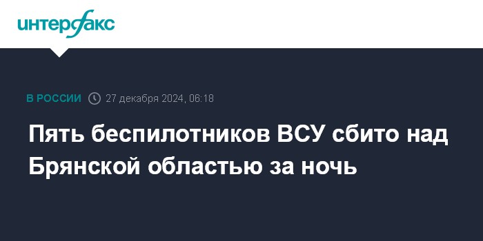 Москва. 27 декабря. INTERFAX.RU - Губернатор Брянской области Александр Богомаз сообщил об уничтожен пяти украинских беспилотников самолетного типа над регионом в ночь на пятницу.