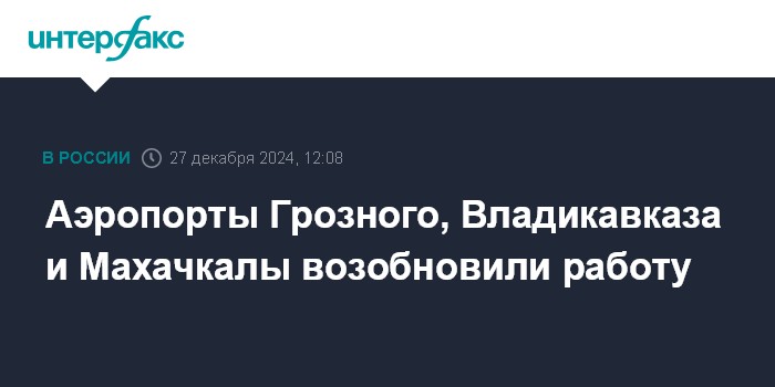 Москва. 27 декабря. INTERFAX.RU - Международные аэропорты Грозного ("Северный", Чечня), Владикавказа (Северная Осетия, входит в "Новапорт") и Махачкалы (Дагестан) работают в штатном режиме после введения временных ограничений, сообщает пресс-секретарь Федерального агентства воздушного транспорта (Росавиация) Артем Кореняко.