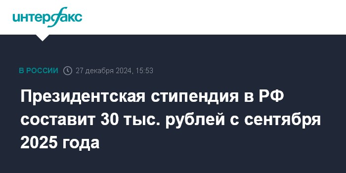 Москва. 27 декабря. INTERFAX.RU - Стипендии президента России в размере 30 тыс. рублей будут назначаться с 1 сентября 2025 года сроком на один год и выплачиваться ежемесячно.