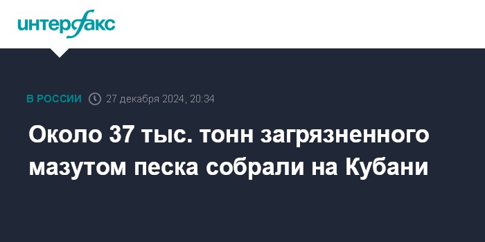 Москва. 27 декабря. INTERFAX.RU - Около 37 тыс. тонн загрязненного мазутом песка и грунта вывезли с Черноморского побережья Краснодарского края для утилизации на специализированные предприятия, сообщает пресс-служба МЧС РФ.
