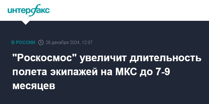 Москва. 28 декабря. INTERFAX.RU - "Роскосмос" сообщил о планах увеличить с 2025 года длительность полета экипажей кораблей "Союз МС" на Международной космической станции (МКС) с шести до семи-девяти месяцев, что позволит сэкономить по одному кораблю каждые два года. Об этом говорится в сообщении, посвященном работе госкорпорации в 2024 году.