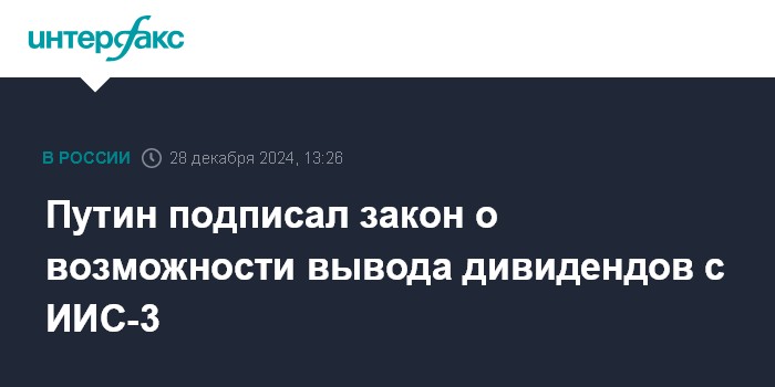 Москва. 28 декабря. INTERFAX.RU - Президент РФ Владимир Путин подписал закон, разрешающий перевод дивидендов по акциям, учитываемым на индивидуальных инвестиционных счетах третьего типа (ИИС-3), на другие счета.