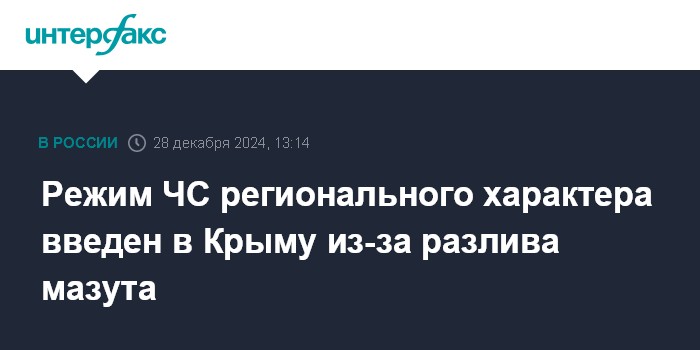 Москва. 28 декабря. INTERFAX.RU - Режим ЧС регионального характера введен в Крыму из-за разлива мазута с потерпевших крушение в Керченском проливе танкеров, следует из опубликованного в субботу на портале правительства республики указа главы региона Сергея Аксенова.