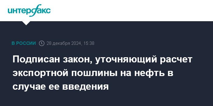 Подписан закон, уточняющий расчет экспортной пошлины на нефть в случае ее введения
