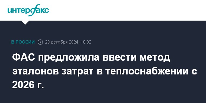Москва. 28 декабря. INTERFAX.RU - ФАС России предложила ввести метод эталонов затрат в теплоснабжении. Соответствующий проект постановления правительства опубликован на Федеральном портале проектов нормативных правовых актов.